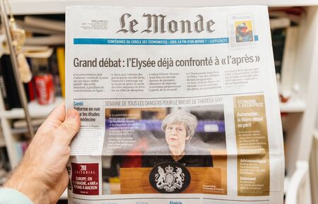 Paris, France - Mar 12, 2019: Man holding in living room library French newspaper Le Monde featuring on the cover Theresa May and last deals about Brexit