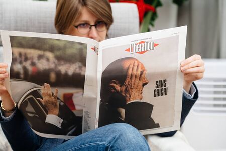 Paris, France - Sep 27, 2019: Woman reading French Liberation in living room newspaper following the death of former French President Jacques Chirac at the age of 86 years.
