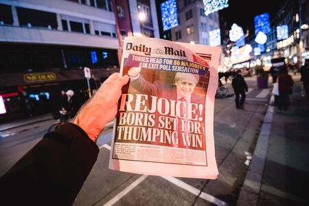 Paris, France - Dec 14, 2019: Man reading in city at night UK Daily Mail newspaper press the day after UK PM Boris Johnsons Conservative Party won a landslide Early General victory brexit rejoice