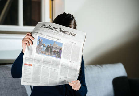PARIS, FRANCE - JAN 21, 2021: Woman reading Frankfurter Allgemeine German newspaper featuring breaking news and headlines with Joe Biden inauguration as the 46th President of the United States