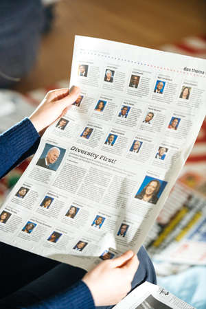 PARIS, FRANCE - JAN 21, 2021: Woman reading German newspaper featuring all key people in Biden Administration after inauguration as the 46th President of the United States