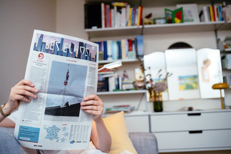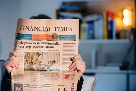 Paris, France - Sep 27, 2019: Woman reading Financial Times in living room newspaper following the death of former French President Jacques Chirac at the age of 86 years