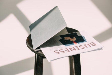 close-up view of laptop with business newspaper on wooden stool on grey