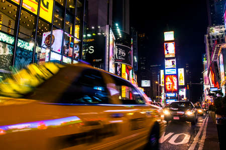 Bright neon signage flashes over crowds and taxi traffic zooming past Times Square the venue of the city's famous New.
