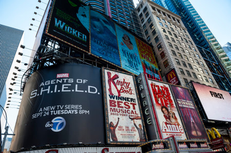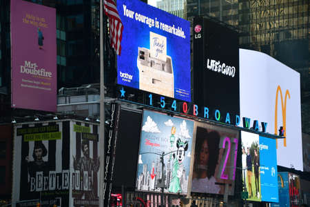 NEW YORK - JULY 16, 2020: Broadway musicals billboards in Midtown Manhattan. All New York City Broadway shows have been cancelled through January 03, 2021