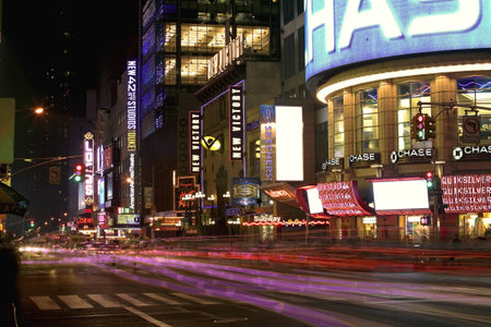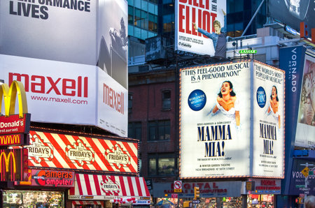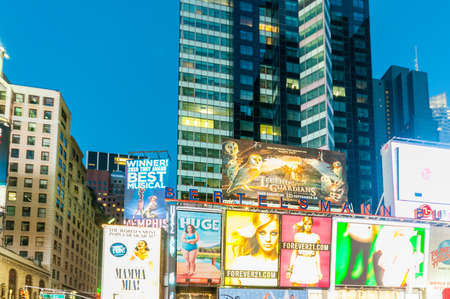 Commercials of theaters in Times Square on Broadway in New York at night, USA