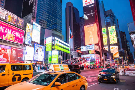 New York City, United States - Apr 4, 2019: Crowded people, car traffic transportation, billboards and advertising signs at night in Times Square. American lifestyle or modern city life concept