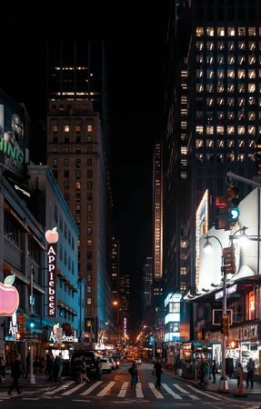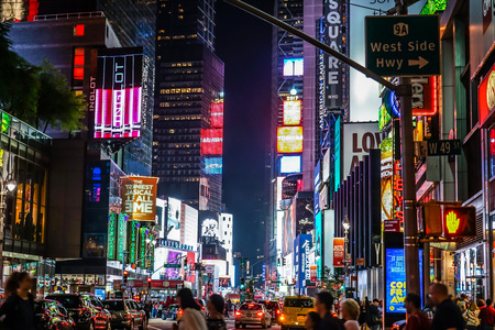 New York, USA- September 06, 2017 : Night view of Times Square-central and main square of New York. Street, cars, people and tourists on it.