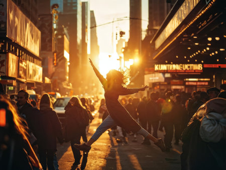 Vibrant Times Square at night illuminated by glowing billboards and colorful city lights with...