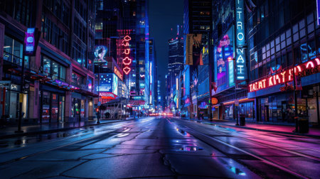 This image presents a stunning night-time cityscape bathed in neon lights, with reflections on streets creating a futuristic atmosphere. Resplendent.