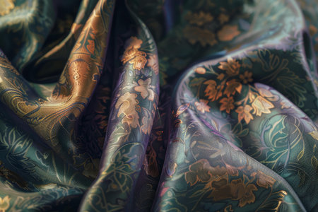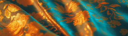 This image showcases an elegant fabric featuring a detailed floral design. The composition highlights flowing folds with colors including teal, gold and magenta, and the texture gives a sense of depth. The lighting creates highlights and shadows, giving the textile an opulent appearance. It is suitable for design, textile, and decorative purposes.