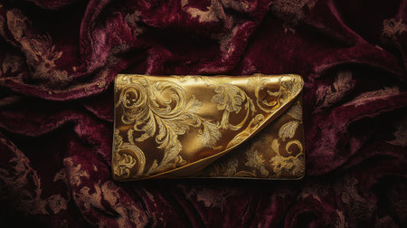 This image showcases an elegant golden wallet featuring intricate floral patterns, resting on a luxurious red velvet backdrop, exuding sophistication and charm.