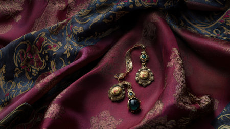 A close-up view of a beautifully crafted metallic ornament on a rich textile, highlighting intricate design and traditional artistry in textile craftsmanship and cultural heritage.