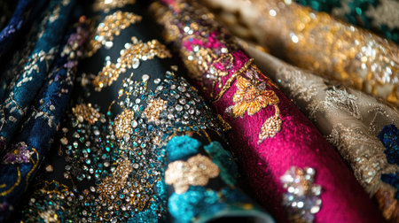 A close-up view of beautiful fabric textiles showcasing vibrant colors and intricate embroidery adorned with stunning beading, perfect for various creative projects.