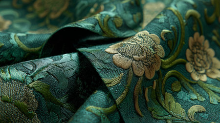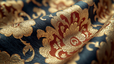 Closeup of luxurious brocade textile showcasing intricate floral design and rich texture