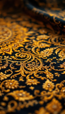 Luxurious gold embroidery on rich dark fabric with intricate floral patterns.