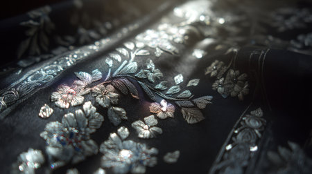 This image showcases a beautifully embroidered fabric featuring intricate floral patterns. Soft natural light highlights the delicate craftsmanship, creating an elegant and luxurious feel.