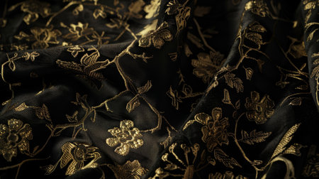This close-up image showcases a luxurious black fabric adorned with intricate golden patterns, perfect for various fashion and textile projects.