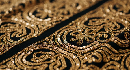 Textured antique gold embroidery, intricate patterns stitched into luxurious fabric.