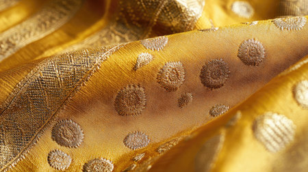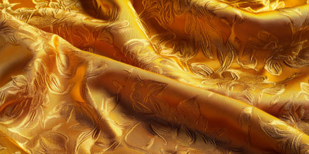 This image captures a luxurious golden fabric adorned with intricate embroidery, showcasing stunning patterns and textures ideal for design inspiration.