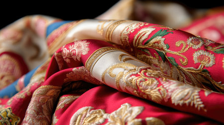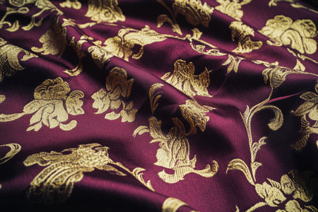 Intricate floral fabric with gold and red patterns draped elegantly on a soft, dark background in a decorative setting. Generative AI