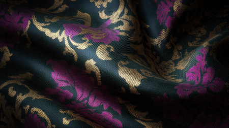 Luxurious digital textile illustration featuring intricate brocade styling, deep navy-black tones, shimmering gold threads, and softly draped folds under subtle low-key lighting. Perfect for premium fashion fabrics, upscale interior decor, elegant packaging designs, and sophisticated branding graphics. Evokes opulence, refinement, and timeless grandeur for lu... AI-generated digital illustration. AI-generated illustration.
