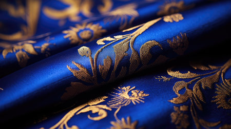 This image features luxurious fabric with intricate gold patterns on a deep blue background, showcasing elegance and rich texture ideal for design projects.