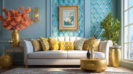 Discover an elegant living room featuring a plush sofa adorned with teal cushions. The intricate wall art and stylish table accessories create a cozy, modern ambiance.