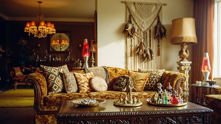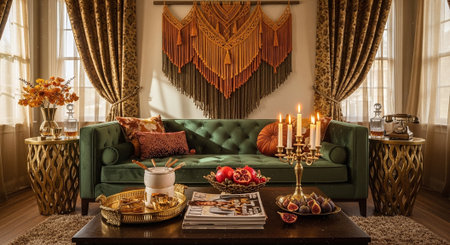 Living room decor, home interior design . Bohemian Glam style with Gallery Wall decorated with Velvet and Gold material . Generative AI AIG26.