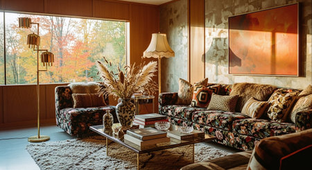 A stylish retro living room with large windows, featuring colorful furniture, a round coffee table, and vibrant floral arrangements