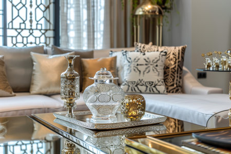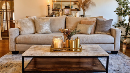 A beautifully arranged living room featuring a soft sofa, intricate coffee table decor, and warm candlelight, creating an inviting and stylish atmosphere for relaxation.