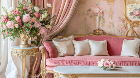 A beautifully styled living room featuring a pink sofa adorned with plush cushions, elegant curtains, and a stunning floral arrangement, evoking luxury and charm.