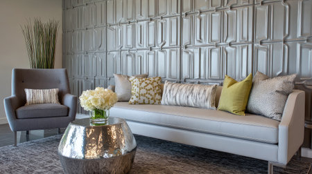 A beautifully designed modern living room featuring a sleek couch adorned with decorative pillows, a stylish armchair, and a unique wall design, creating a cozy ambiance.