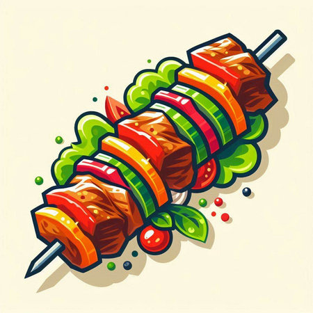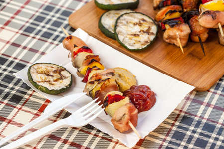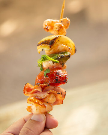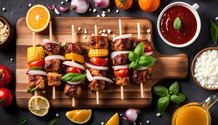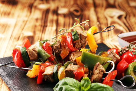 Grilled skewers of meat and vegetables on a wooden board, colorful and tasty dish, tasty meal