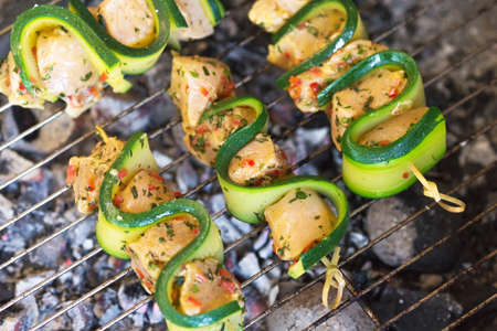 Closeup photo of fresh and delicious chicken skewers covered with spices and seasonig with mushrooms, onions, paprika, zucchini. Ideals as grill snack or party food.
