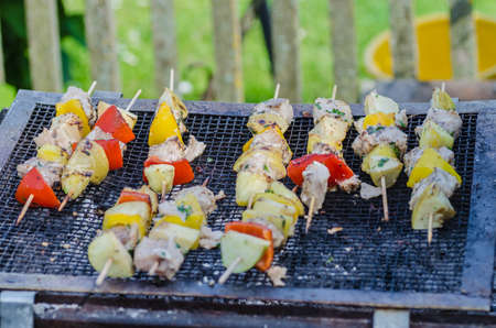 Grilling chicken meat skewers and skebab with vegetables on barbeque charcoal grill