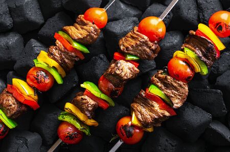 Grilled skewers on wooden sticks, pork meat and vegetables on grill.