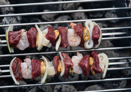 Fish and vegetable skewer ready to barbecue grill. Summer recipe cooking