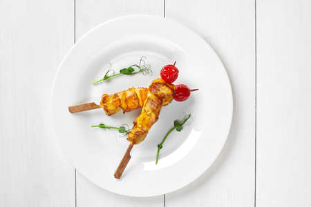 Grilled chicken skewers with cherry tomatoes on a white plate. White wooden table. Top view. Minimal concept