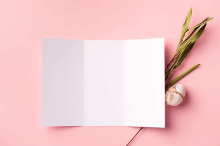 Happy Easter greeting card mock up. Empty brochure with Easter egg and eucalyptus branch on pink background.