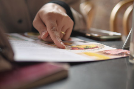 woman is holding and pointing on an empty page as template texture, card, menu or brochure . High quality photo