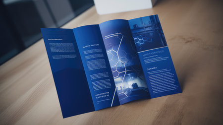 Blank tri fold brochure on blue background to replace your design or message. A mock-up for brand identification for designers