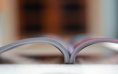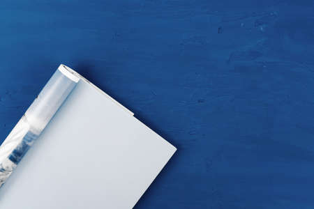 Top view of open magazine page with copy space on classic blue background