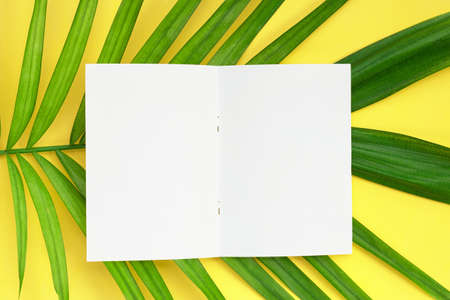 Blank paper with tropical palm leaves on yellow background. Copy space