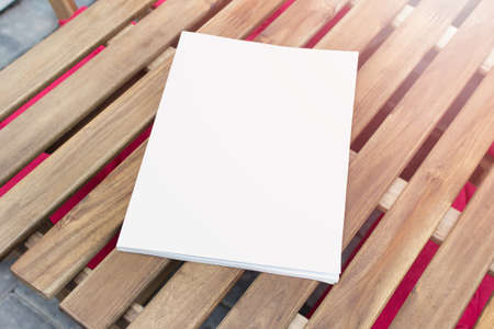 Blank brochure form with a clear title page for your project on a wooden table