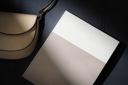 Blank magazine mockup on wooden table, interior design concept.