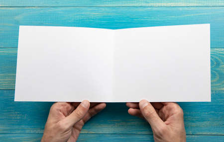 Mens hands holding empty white booklet on blue wooden background. View from above