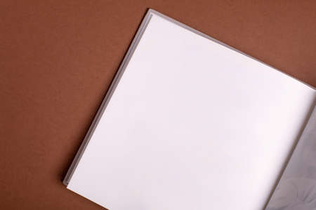 White book mockup. Opened square empty book. Album with clean pages on brown . Clean book mockup. Mock-up is ready to design