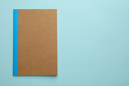 One copybook on light blue background, top view. Space for text