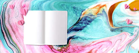 Close up, open page of notepad, delicate postcard, pastel colors. Space for text. Open book with blank colored pages. Selective focus